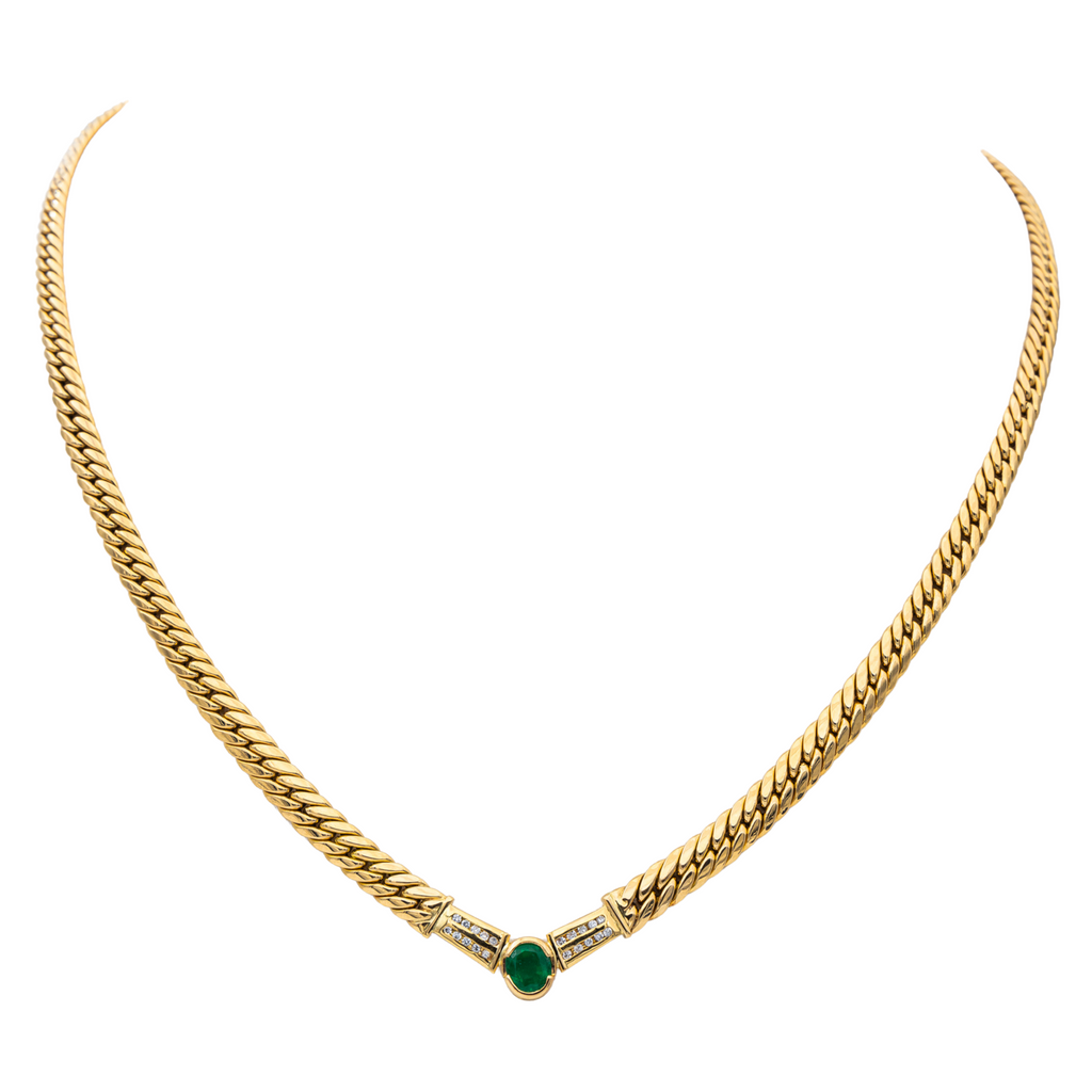 Collier en or jaune 750 millièmes (18 carats), maille anglaise, serti d'une émeraude taille ovale, d'un poids d'environ 1,05 cts, et de 20 diamants taille brillant, estimés H/SI, chacun d'un poids d'environ 0,01 ct, poids total des diamants: environ 0,20 ct, longueur: 51 cm, dimensions de la partie comprenant les motifs: 2,73 cm x 1,34 cm, poids total: 28,15 g, poinçon tête d’aigle, excellent état