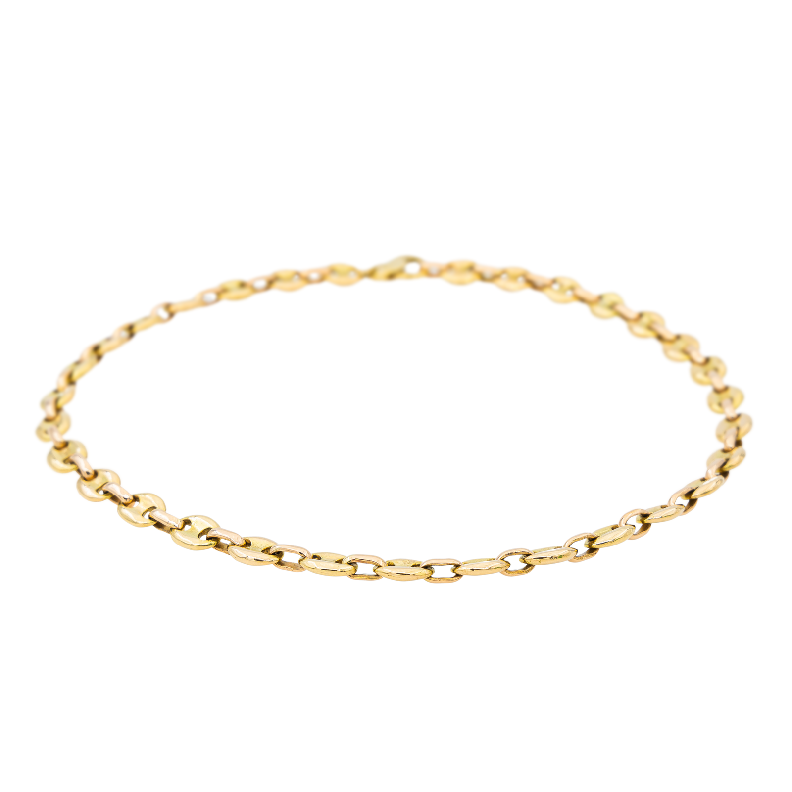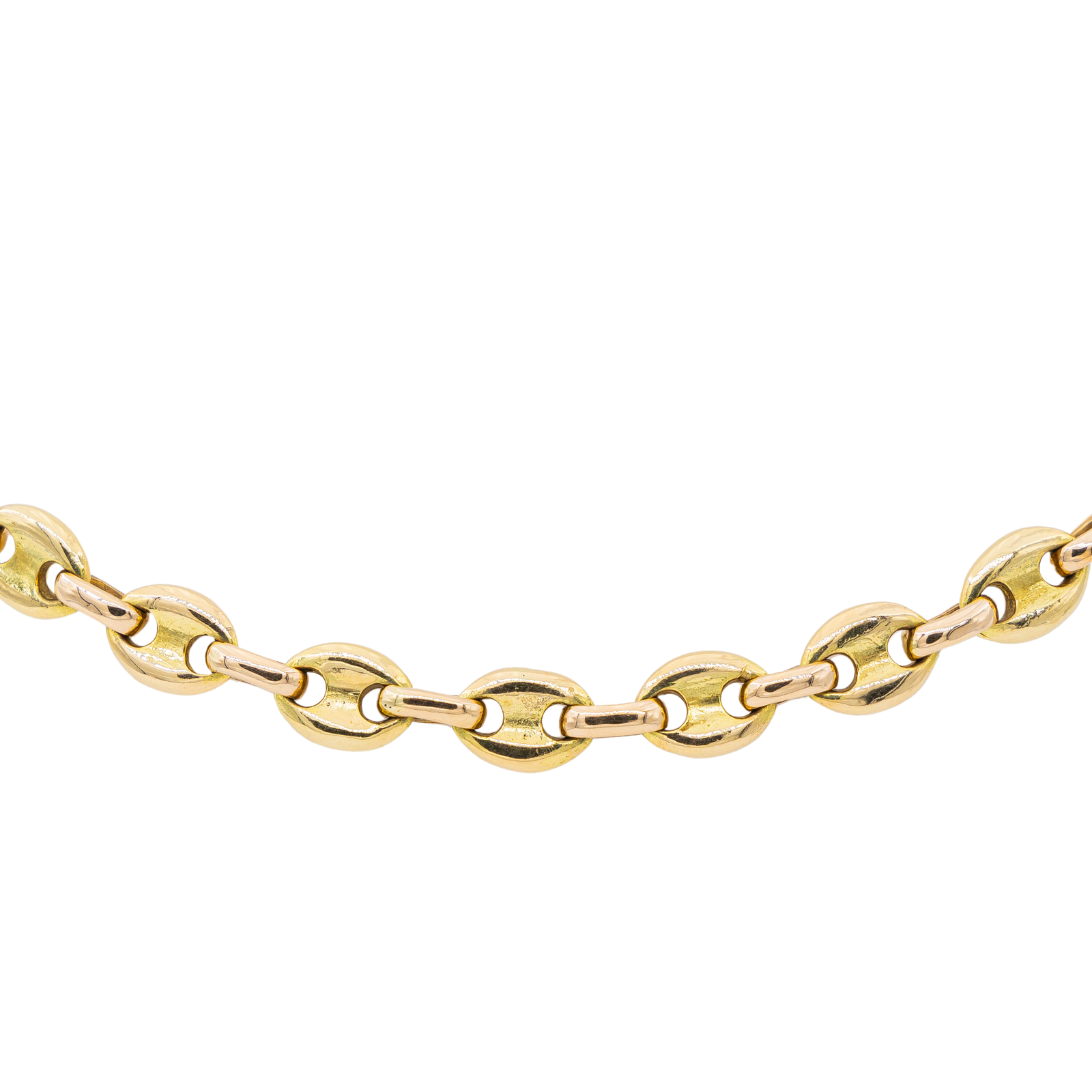 Collier bicolore en or jaune et rose 750 millièmes (18 carats), maille grain de café massive, grains en or jaune et anneaux intermédiaires en Or Rose, longueur: 42 cm, largeur: 0,75 cm, Poids : 62.80 g, poinçon hibou, excellent état