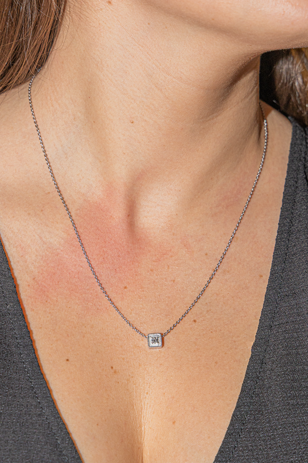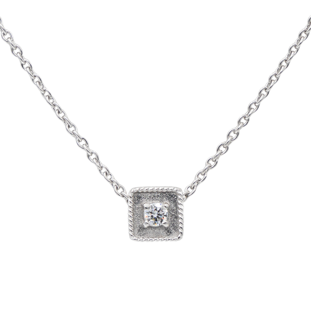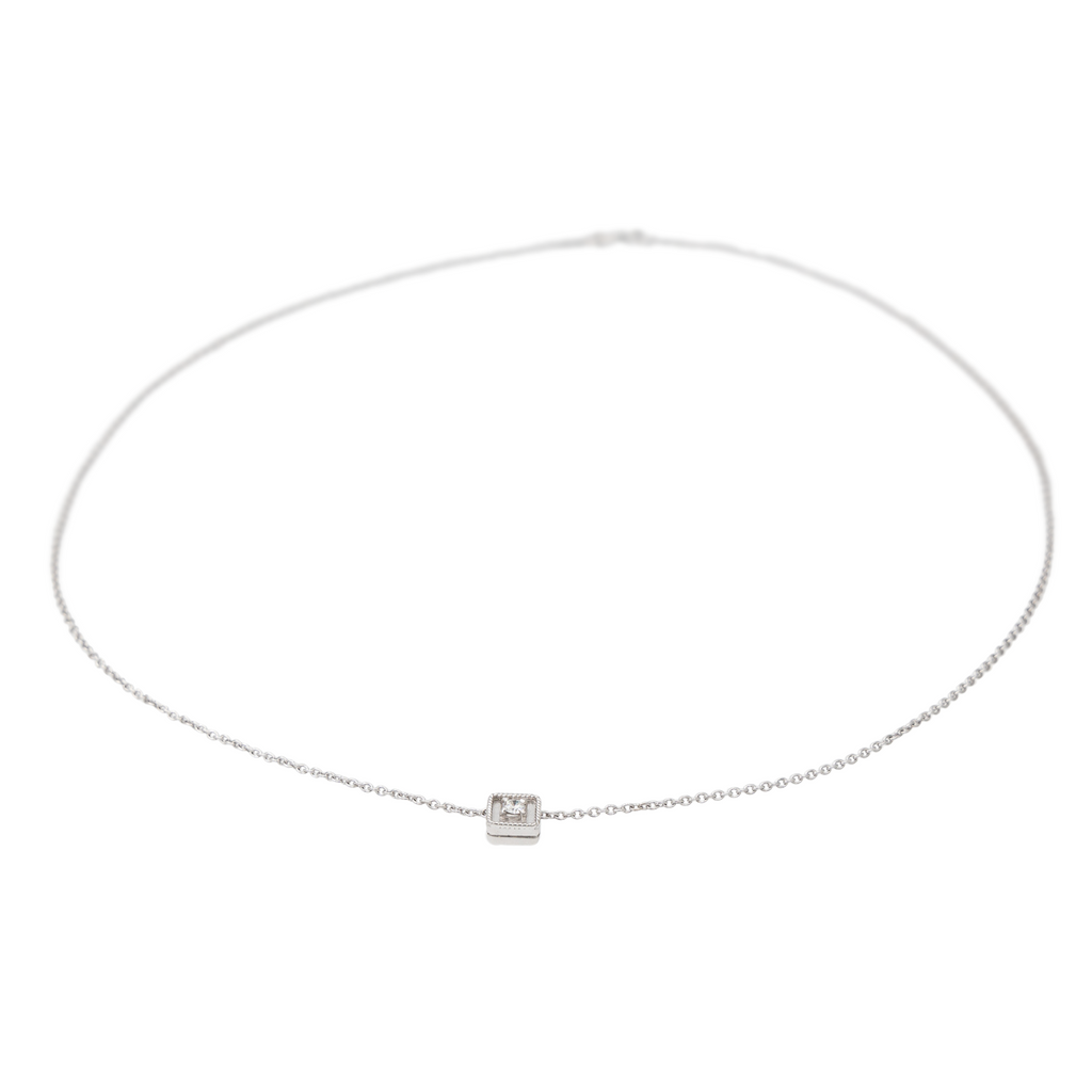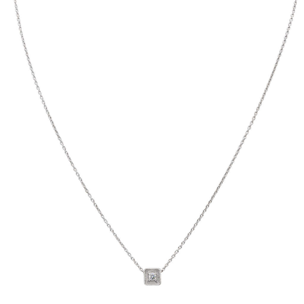 Collier en or blanc 750 millièmes (18 carats), pendentif carré serti d'un diamant taille brillant, environ G-VS , maille ovale, poids total diamant: env 0,08 ct, longueur: 50,50 cm, largeur chaine: 0,10 cm, dimensions du pendentif: 0,70 cm x 0,70 cm, poids total: 4,83 g, poinçon tête d’aigle, excellent état