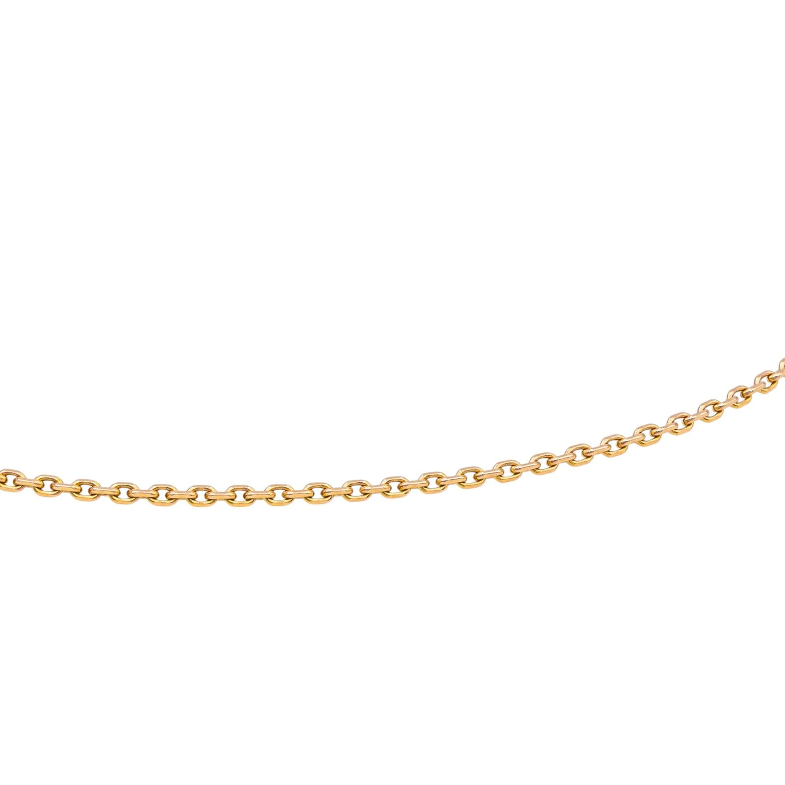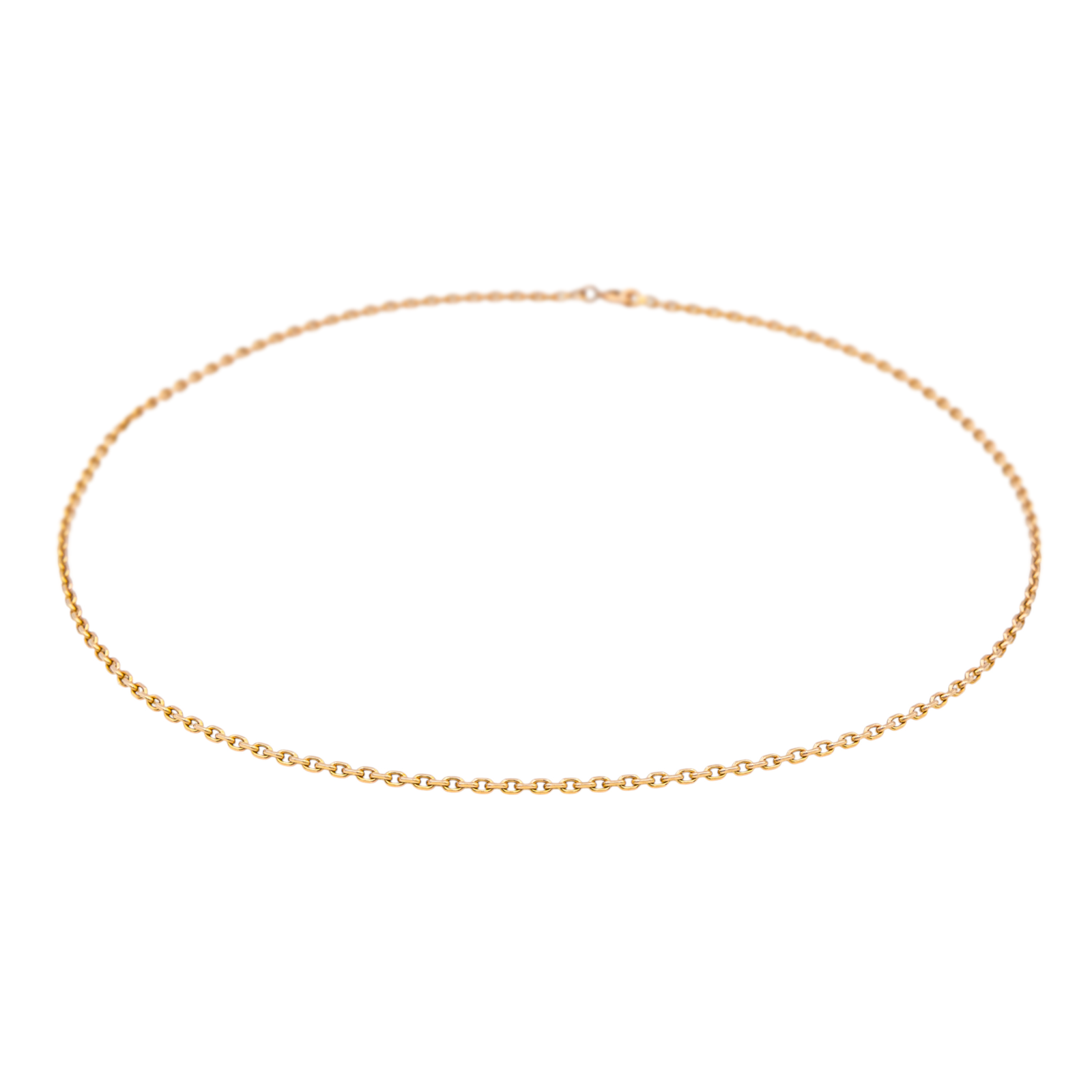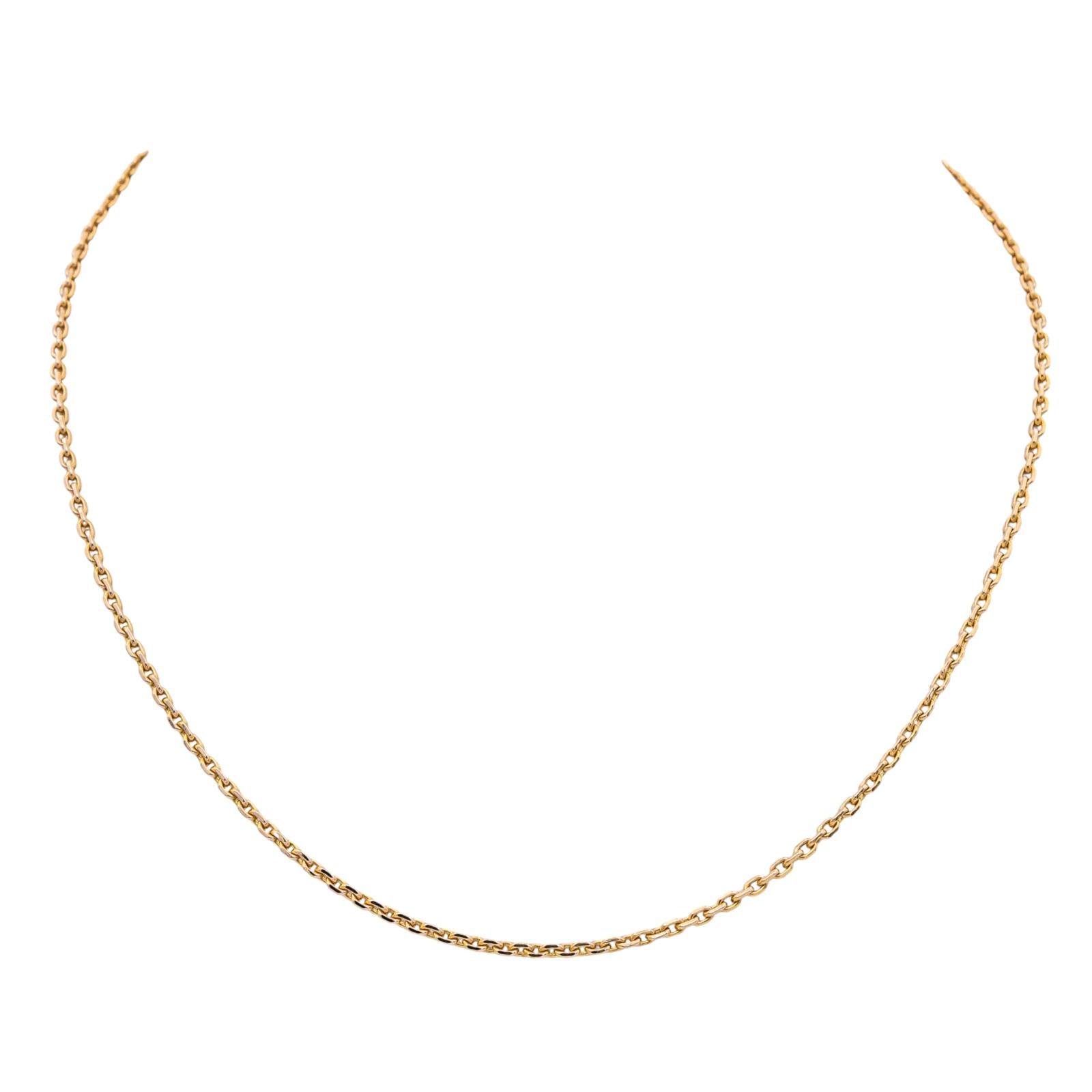 Chaîne en or rose 750 millièmes (18 carats), maille forçat, longueur : 44,5 cm, largeur : 0,15 cm, poids total : 9,10 g, poinçon tête d’aigle, taille 52, excellent état