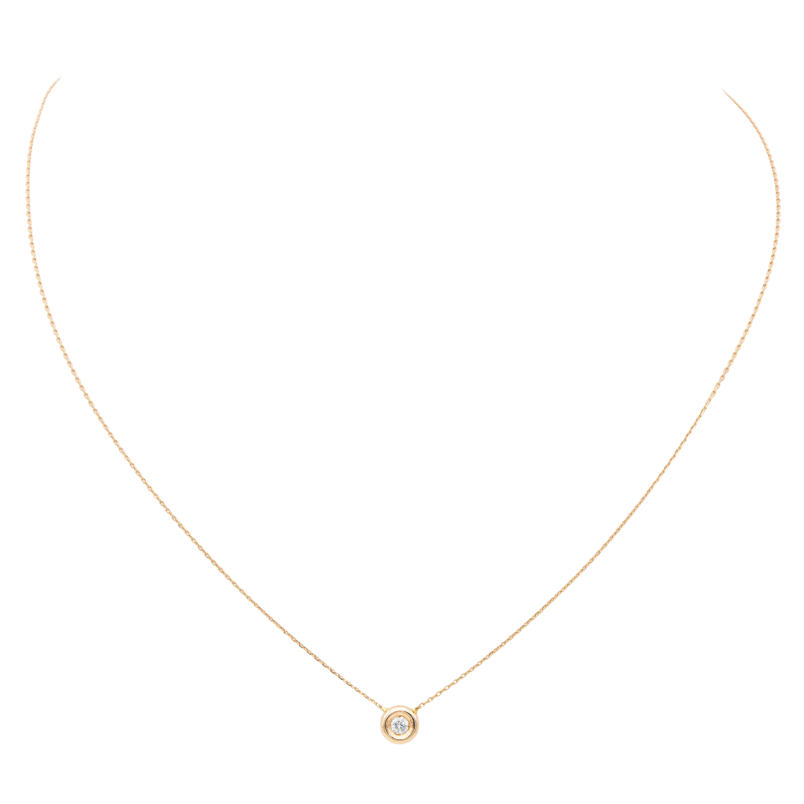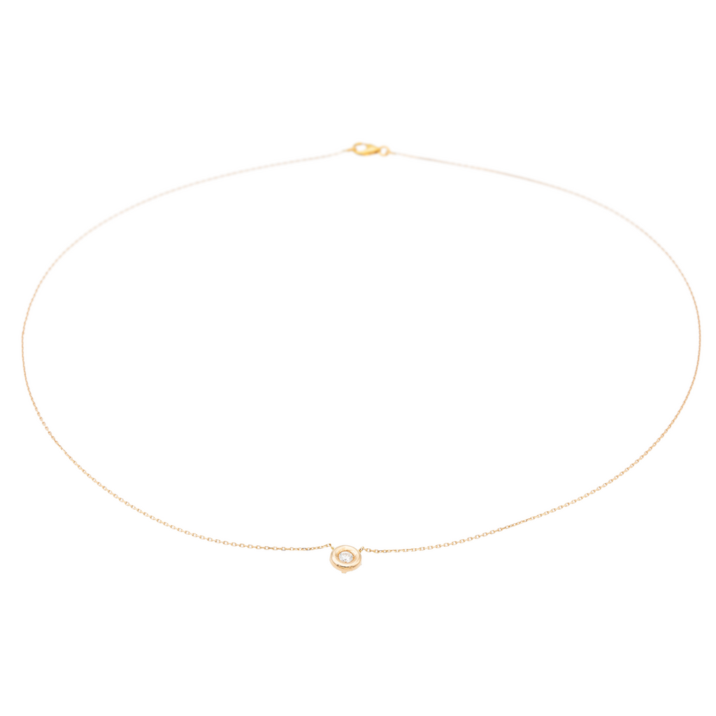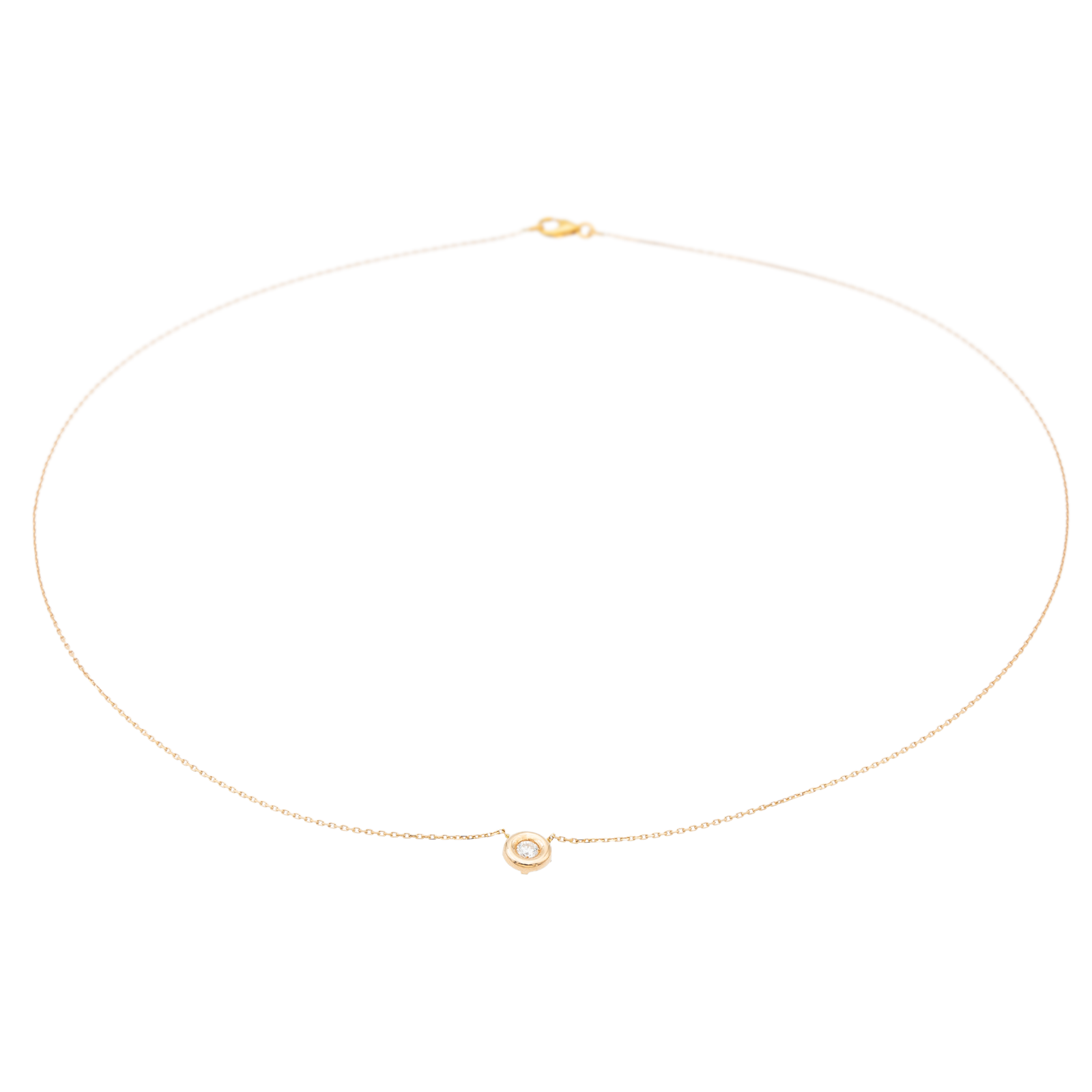 Collier en or rose 750 millièmes (18 carats), fine chaîne en maille forçat sur laquelle est posé un diamant taille brillant G-H V-SI de 0,08 ct en serti clos, Longueur: 42 cm, diamètre du motif: 0,6 cm, largeur de la chaîne: 0,7 mm, poids total: 1,52 g, poinçon tête d'aigle, état neuf