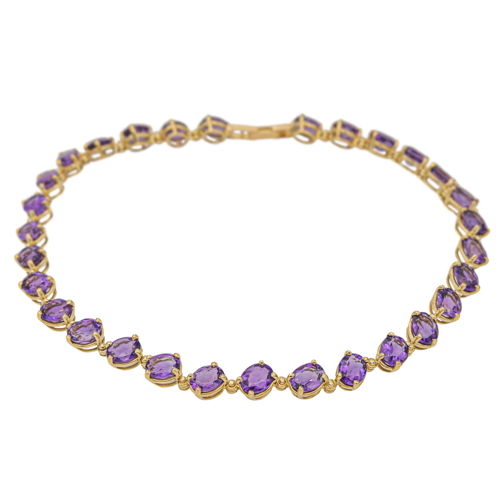 Collier rivière en or jaune 750 millièmes (18 carats), serti de 30 améthystes de taille ovale, chacune environ de 2,36 cts, Poids total estimé des améthystes: 70,80 cts, Longueur: 45 cm, Largeur: 1,13 cm, Poids total: 73,93 g, Poinçon tête d'aigle, Excellent état