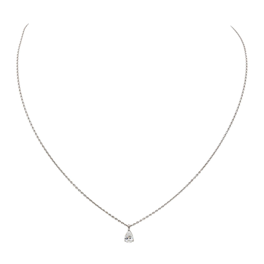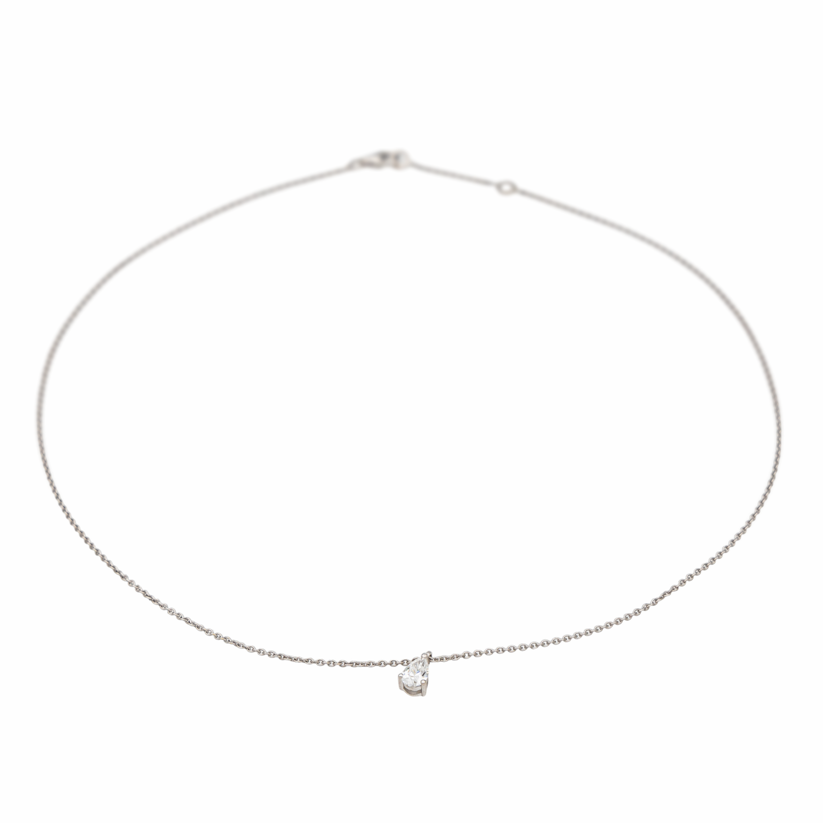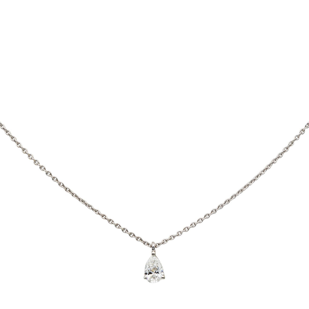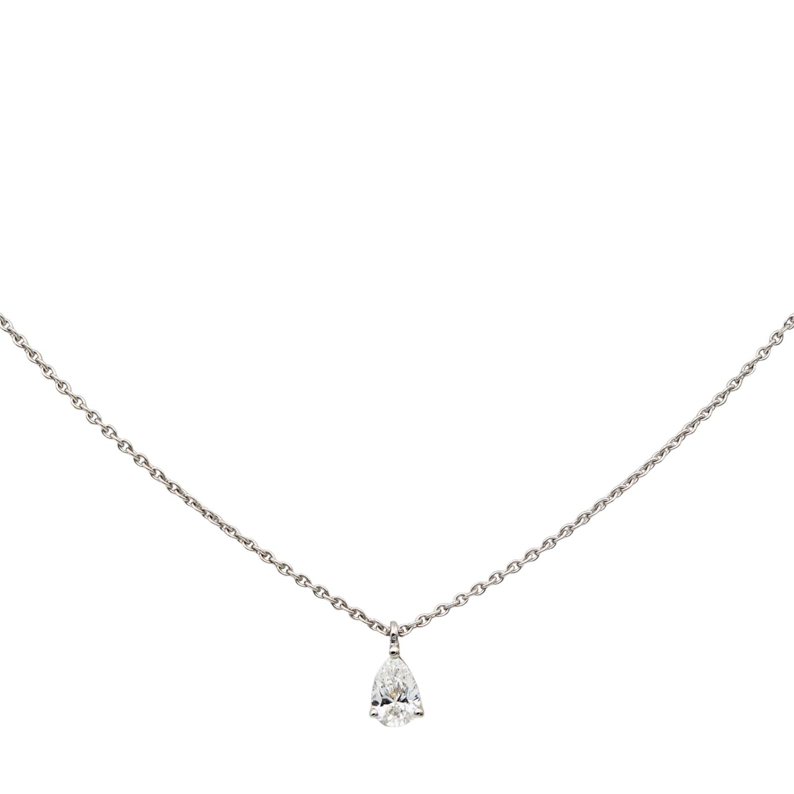 Collier solitaire en or blanc 750 millièmes (18 carats) testé, serti d'un diamant, taille poire, environ E-VS, d'un poids d'environ 0,40 ct, maille forçat, longueur : 42,00 cm, largeur de la chaîne : 0,07 cm, longueur du motif : 0,86 cm, largeur : 0,45 cm, poids total : 2,63 g, excellent état