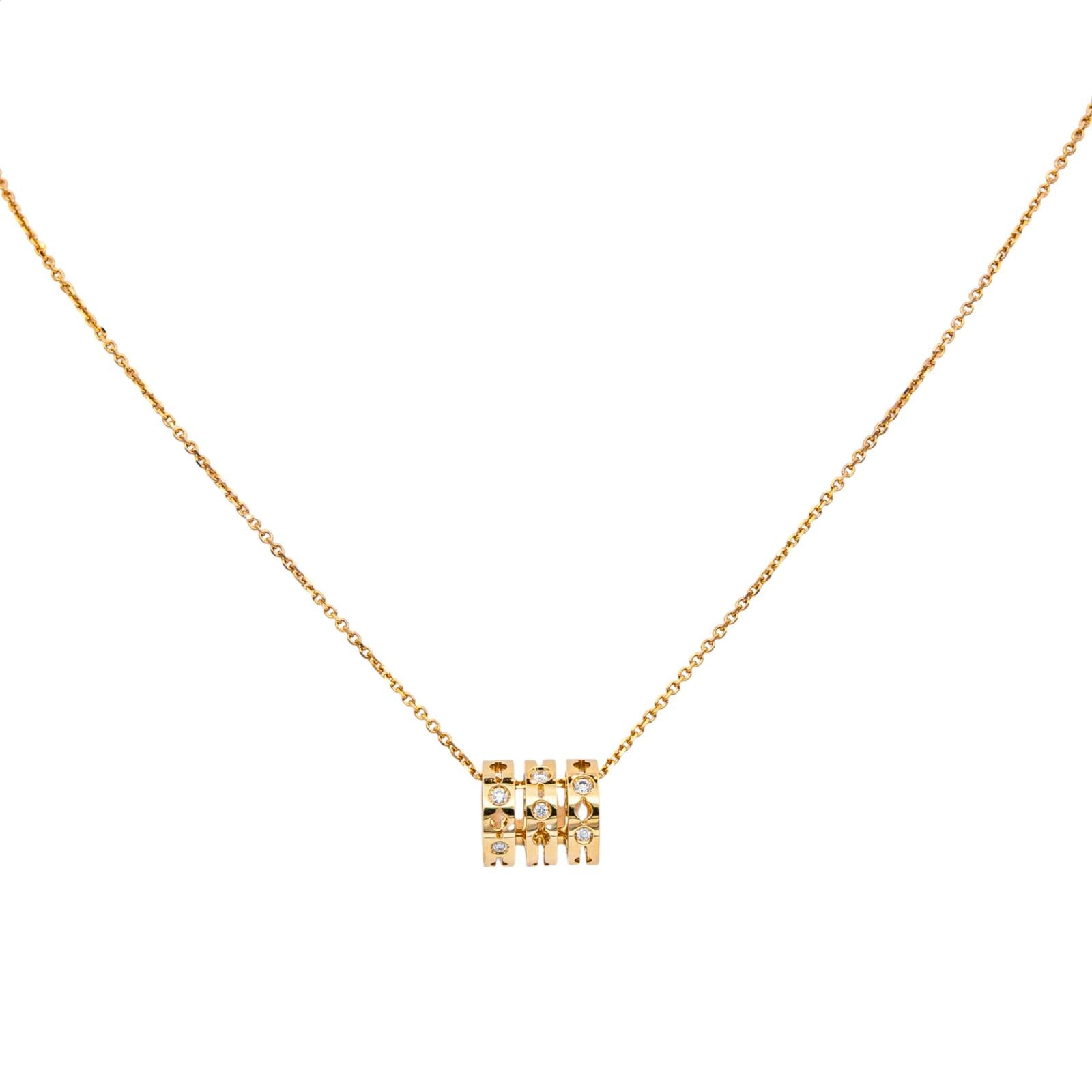 Collier signé de la Maison Dinh Van en or jaune 750 millièmes (18 carats), modèle pulse, motif géométrique serti de 8 diamants, taille brillant, environ G-VS, poids total diamants : environ 0,11 ct, (3 diamants d'un poids d'environ 0,02 ct, 5 diamants d'un poids d'environ 0,01 ct), maille forçat, longueur : 40,00 cm, largeur de la chaîne : 0,07 cm, dimension du motif : 1,10 cm x 1,00 cm, poids total : 5,77 g, poinçon hibou, excellent état
