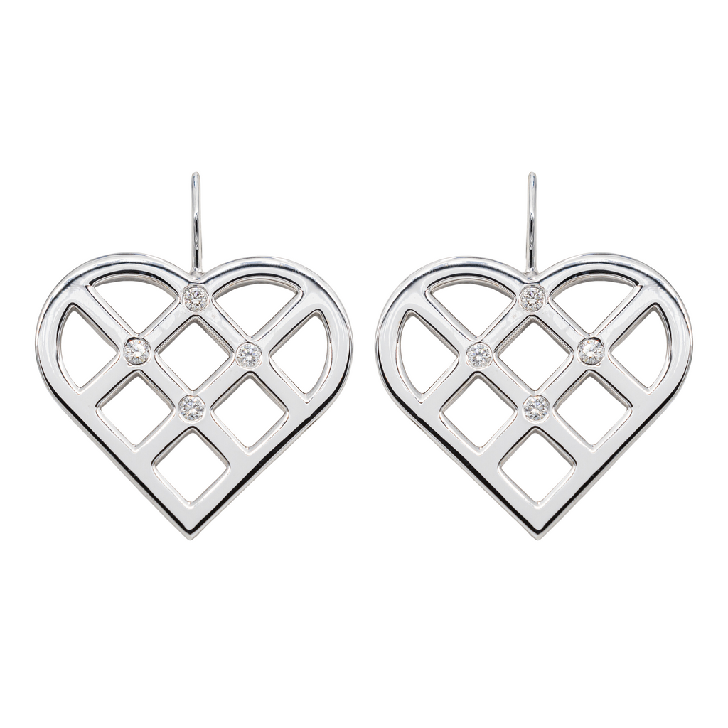 Paire de boucles d'oreilles en or blanc 750 millièmes (18 carats), signée de la Maison OJ Perrin, sertie chacune de 4 diamants taille brillant estimés H/VS, environ 0,01 ct chacun, Poids total estimé des diamants: 0,08 ct, Longueur totale: 2,97 cm, dimensions du coeur: 2,35 x 2,15 cm, Poids total: 14,82 g, poinçon hibou, Excellent état