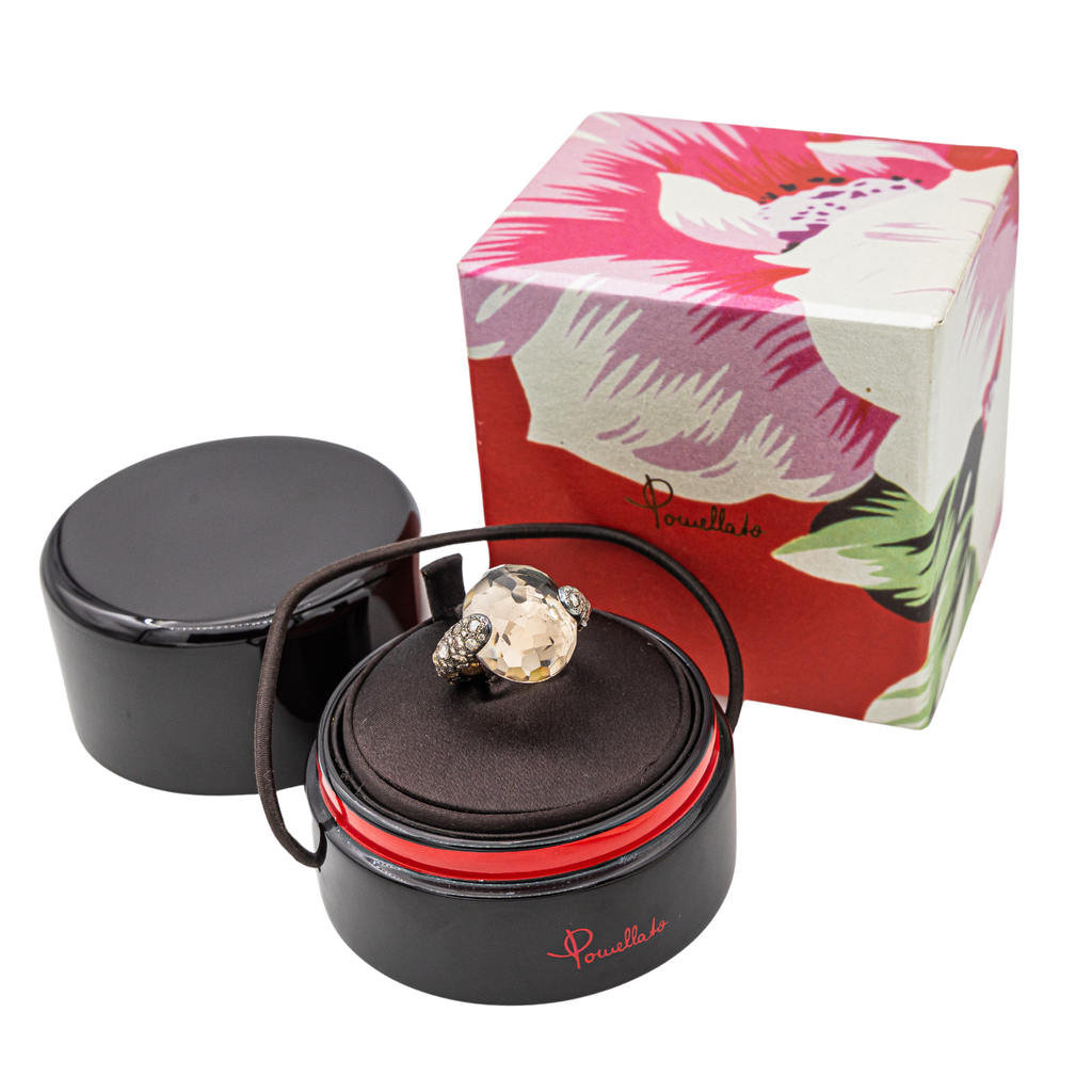 Bague signée de la Maison Pomellato, en or rose 750 millièmes (18 carats), modèle Tango, sertie d'un quartz fumé taille cabochon facetté, d'un poids total d'environ 27,61 cts, entouré de 17 diamants bruns taille rose, d'un poids total d'environ 1,70 cts, (chaque diamant d'un poids d'environ 0,10 ct), 76 diamants bruns taille brillant, d'un poids total d'environ 1,19 cts, (58 diamants d'un poids d'environ 0,005 ct, 18 diamants d'un poids d'environ 0,05 ct), poids total diamants environ : 2,89 cts, largeur sur le dessus : 2,10 cm, tour de doigt : 51, poids total : 18,76 g, poinçon tête d'aigle, vendue avec écrin d’origine Pomellato, excellent état