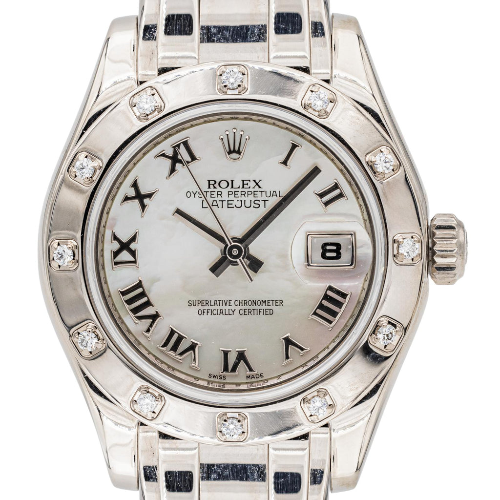 Montre Rolex modèle datejust "Pearlmaster" or blanc "750 millièmes (18 carats)", n°série Z575785, cadran nacre à chiffres romains, sertie de 12 diamants taille brillant, environ H-VS, d'un poids total d'environ 0,24 ct (chaque diamant d'un poids d'environ 0,02 ct), mouvement mécanique à remontage automatique, boîtier 29 mm, verre saphir, bracelet or blanc à boucle déployante (taille poignet 15,5 cm, largeur bracelet 1,38 cm), poids total : 106,80 g, année 2006, révision complète et garantie 1 an, poinçon saint-bernard, excellent état