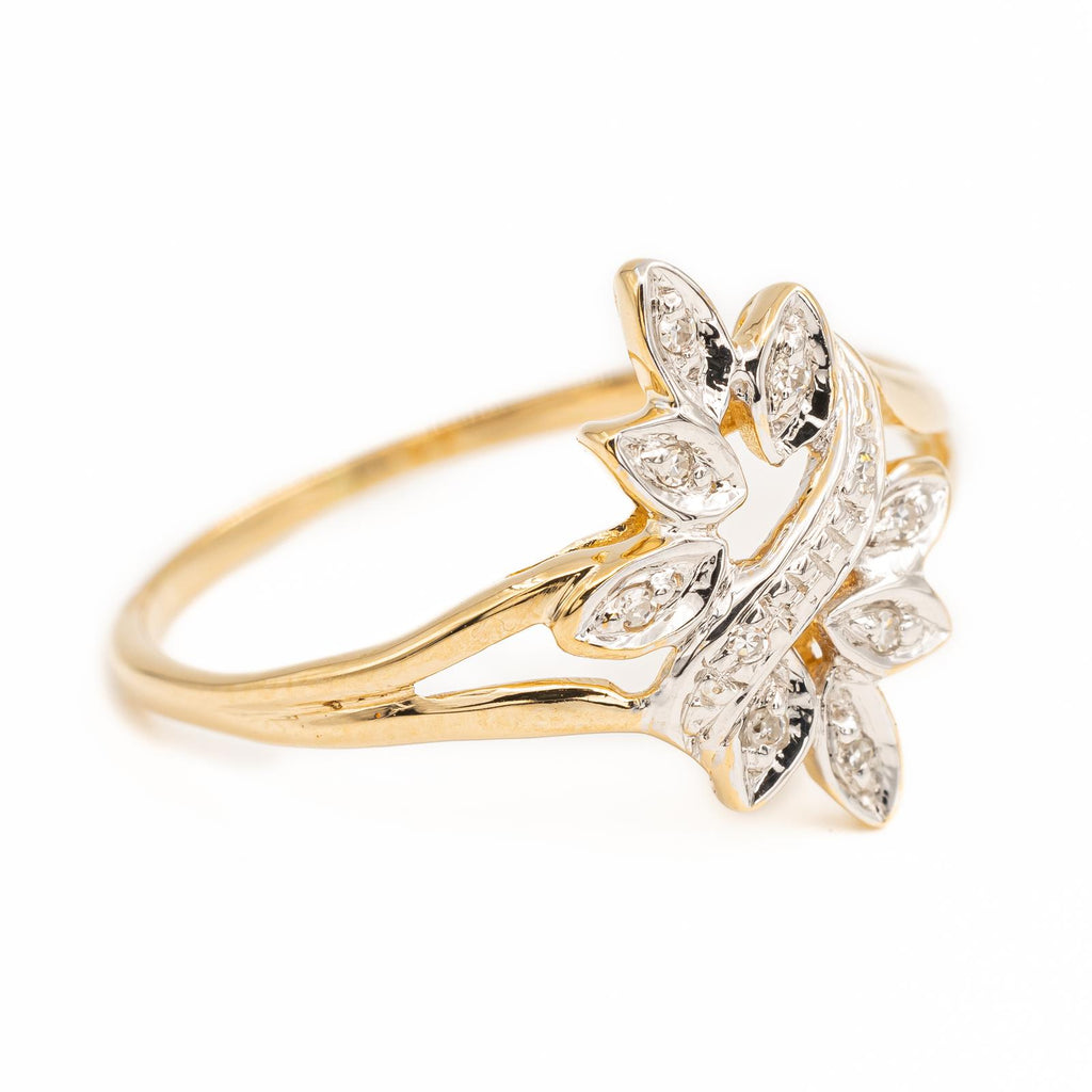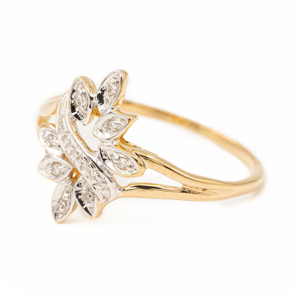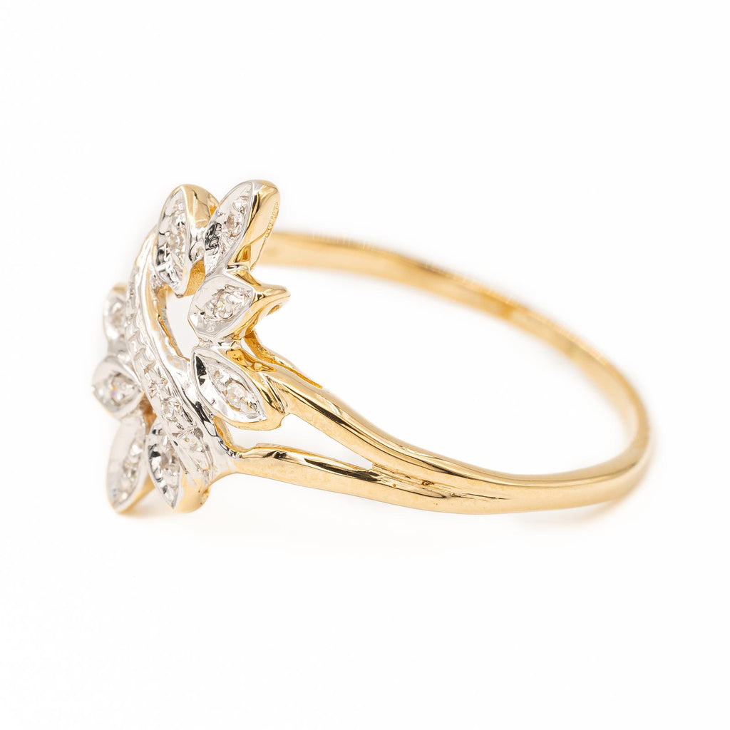 Bague fleur or jaune et blanc 750 millièmes (18 carats) testé, sertie de 10 diamants taille brillant environ H-SI, d'environ 0,005 ct chacun, poids total diamants: environ 0,05 ct, largeur sur le dessus: 1,33 cm, taille de doigt: 50, poids total: 1,74 g, excellent état