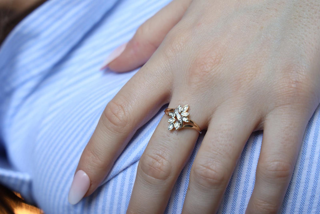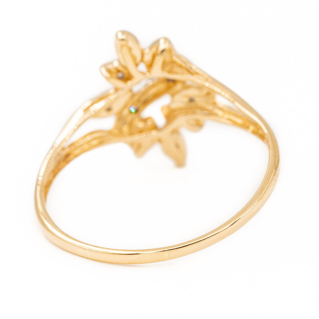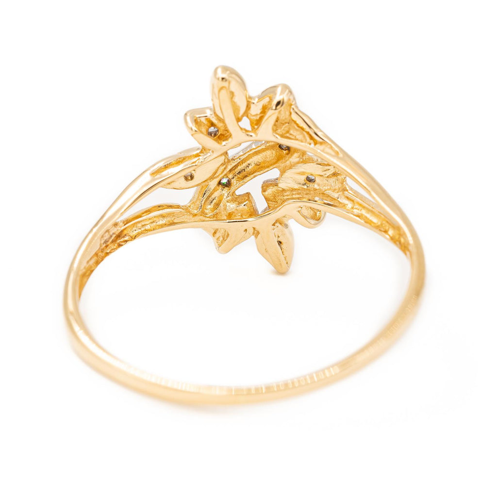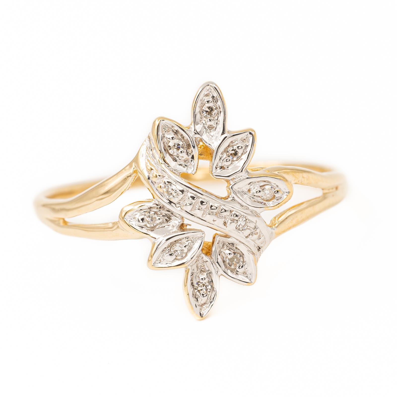 Bague fleur or jaune et blanc 750 millièmes (18 carats) testé, sertie de 10 diamants taille brillant environ H-SI, d'environ 0,005 ct chacun, poids total diamants: environ 0,05 ct, largeur sur le dessus: 1,33 cm, taille de doigt: 50, poids total: 1,74 g, excellent état