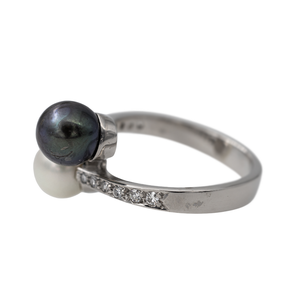 Bague en or blanc 750 millièmes (18 carats), sertie d'une perle de culture de Tahiti, d'une perle de culture blanche, et de 12 diamants taille huit/huit, estimés H/VS, poids total diamants: environ 0,20 ct, largeur sur le dessus: 1,47 cm, tour de doigt: 55, poids total: 6,23 g, poinçon hibou, excellent état