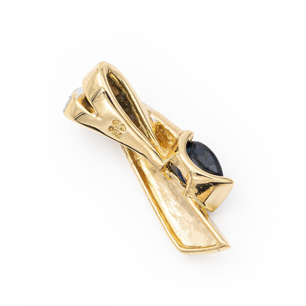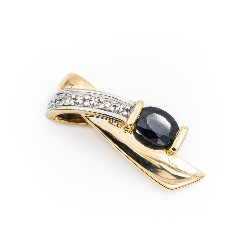 Pendentif en or jaune 750 millièmes (18 carats) testé, Serti d'un saphir oval environ 0,30 ct, et de 2 diamants taille brillant, estimés G/VS environ 0,01 ct chacun Poids total des diamants: 0,02 ct, Dimensions: 1,72 x 0,85 cm, Poids total: 1,15 g, Excellent état