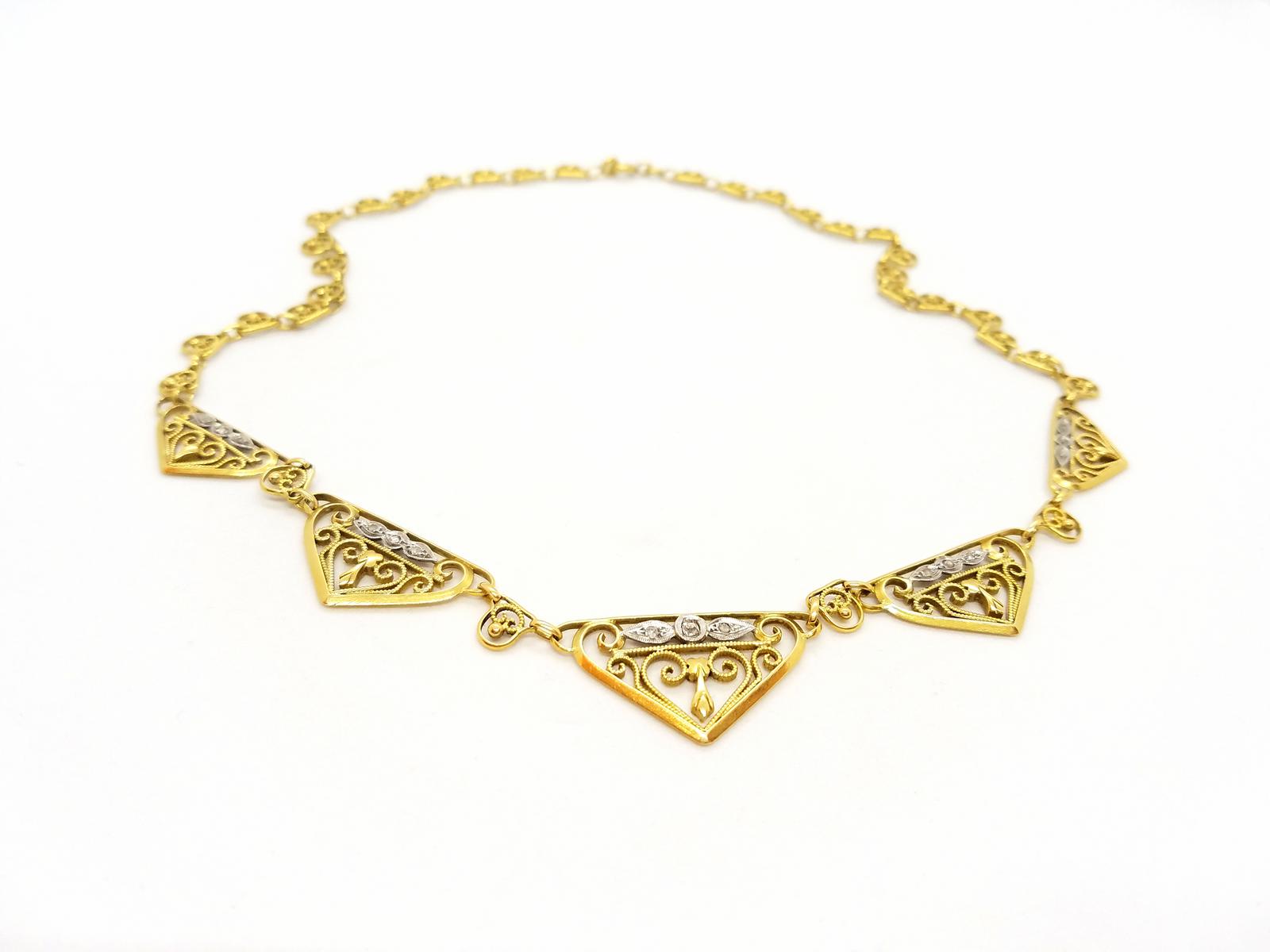 Vintage necklace, in 750 thousandths (18 carat) yellow gold, in filigree, 5 pavé motifs on platinum with 3 diamonds each, 15 diamonds in total old H-SI cut for approximately 0.10 ct, length: 44 cm, dimensions of the motif central: 3 cm x 1.7 cm, total weight: 19.32 g, eagle head hallmark, excellent condition, Internet exclusive