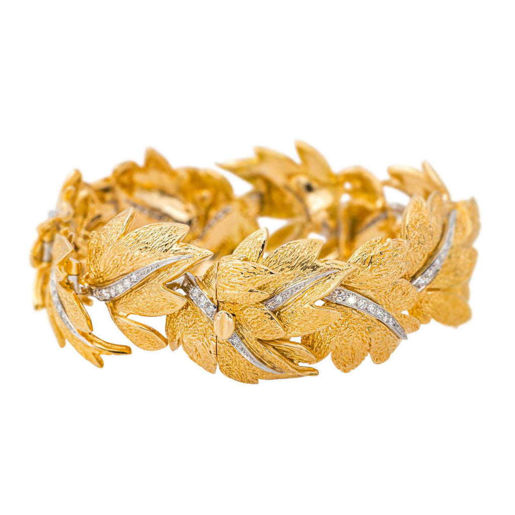 Bracelet signé de la Maison Fabergé en or jaune 750 millièmes (18 carats) et en platine 950 millièmes, serti de 91 diamants taille brillant, environ H-VS, d'un poids total d'environ 1,12 ct, (chaque diamant d'un poids d'environ 0,01 ct) maille souple, longueur : 19,50 cm, largeur : 2,30 cm, épaisseur : 0,70 cm, poids total : 67,21g, poinçon tête de chien et rhinocéros, année 1983, excellent état