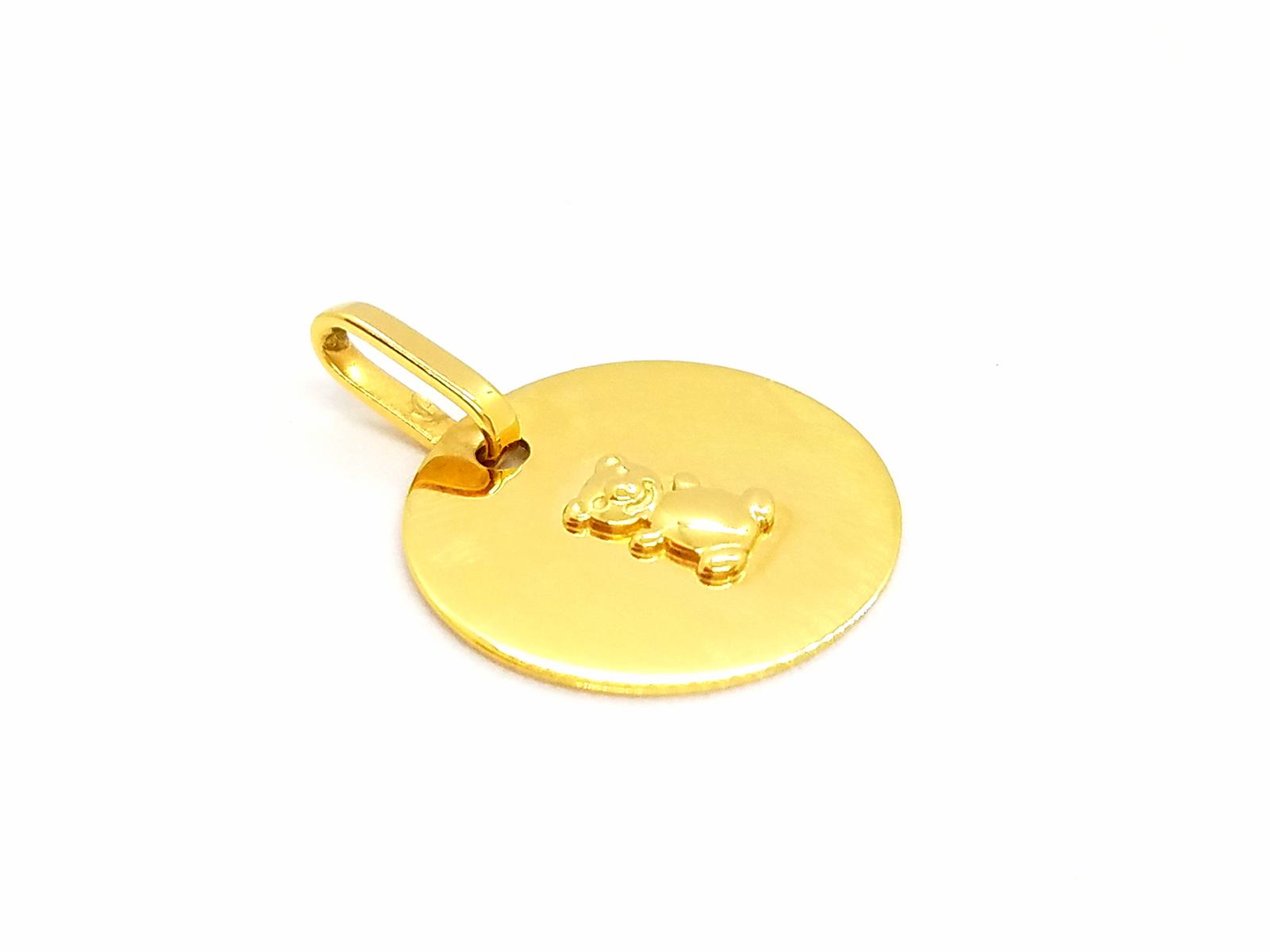 Pendant in 750 thousandths (18 carat) yellow gold tested, medallion with teddy bear, diameter: 1.6 cm, height including bail: 2.17, total weight: 1.49 g, new condition, Internet exclusive