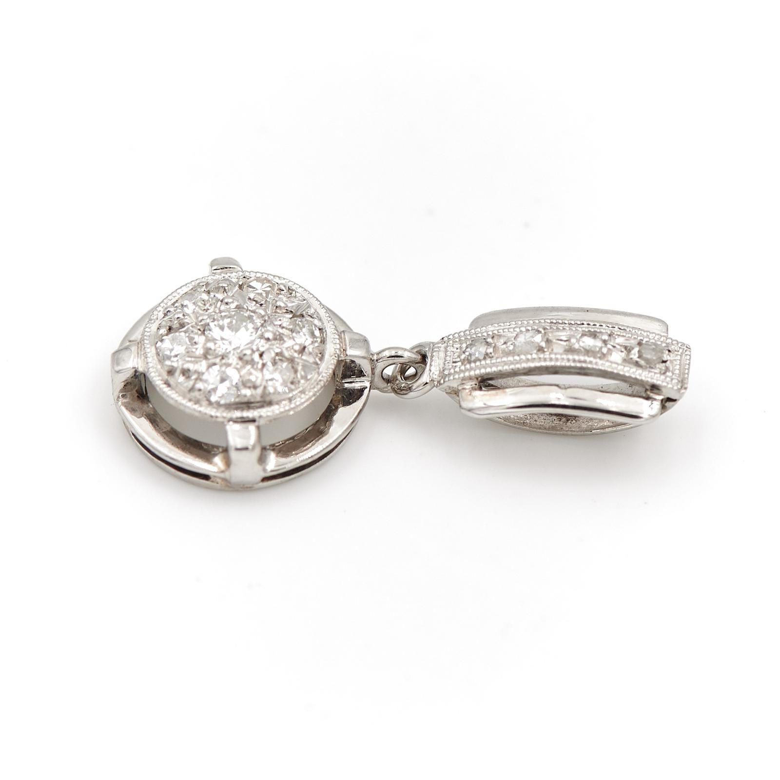 Pendentif en or blanc 750 millièmes (18 carats), serti d'un diamant central taille brillant d'environ 0,04 ct, de 6 diamants taille brillant d'environ 0,02 ct chacun et de 4 diamants taille rose d'environ 0,01 ct chacun, Poids total des diamants: 0,20 ct, Diamants estimés G/VS, Longueur: 2 cm, Largeur: 0,90 cm, Poids total: 1,21 g, Poinçon tête d'aigle, Excellent état