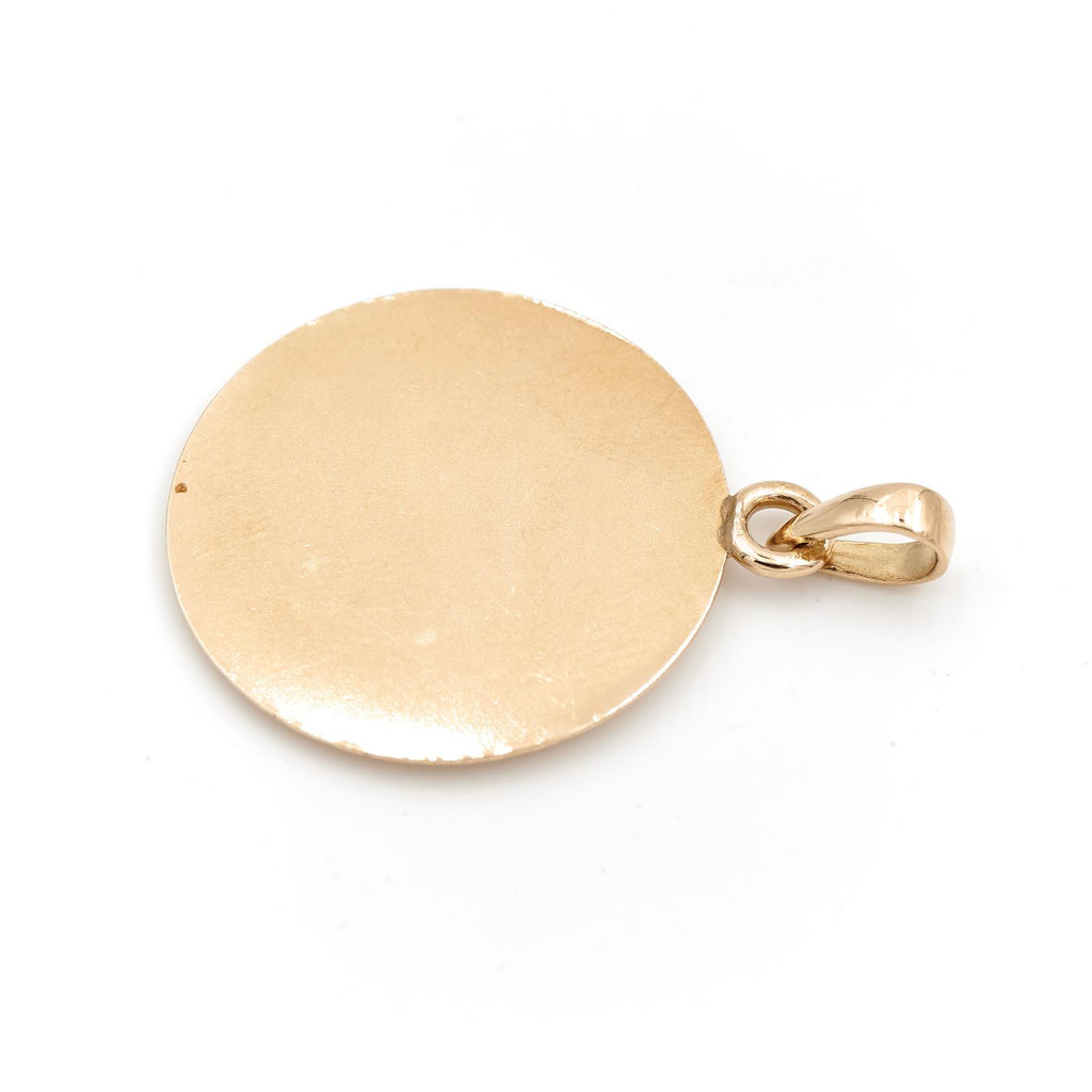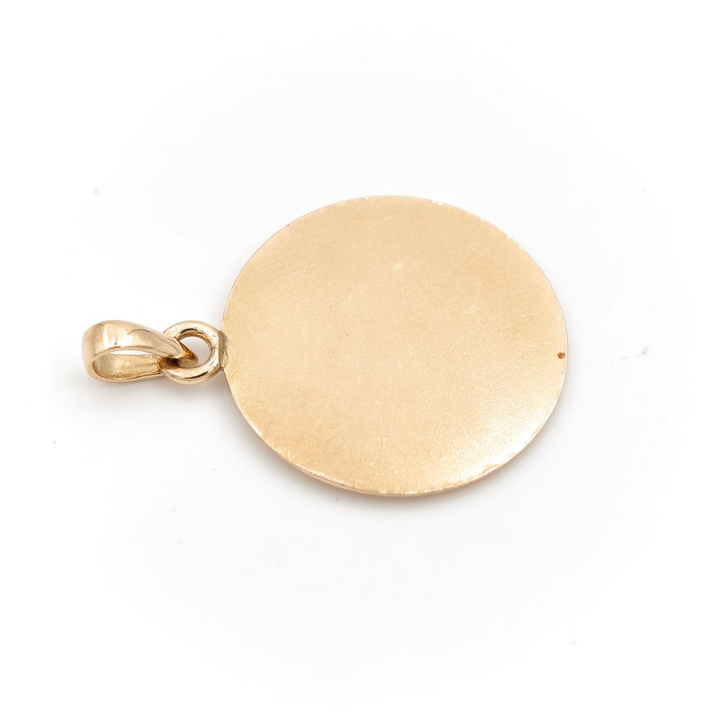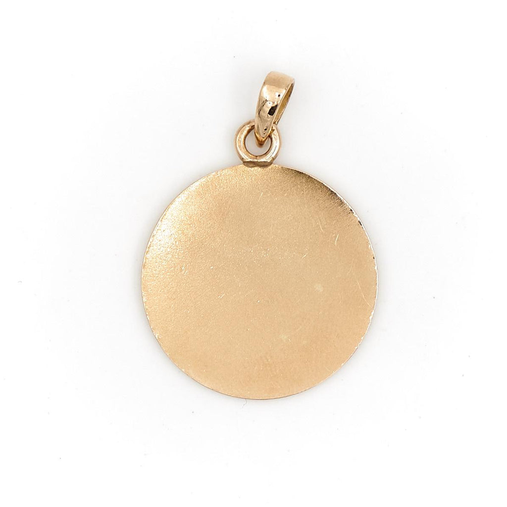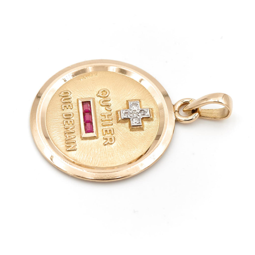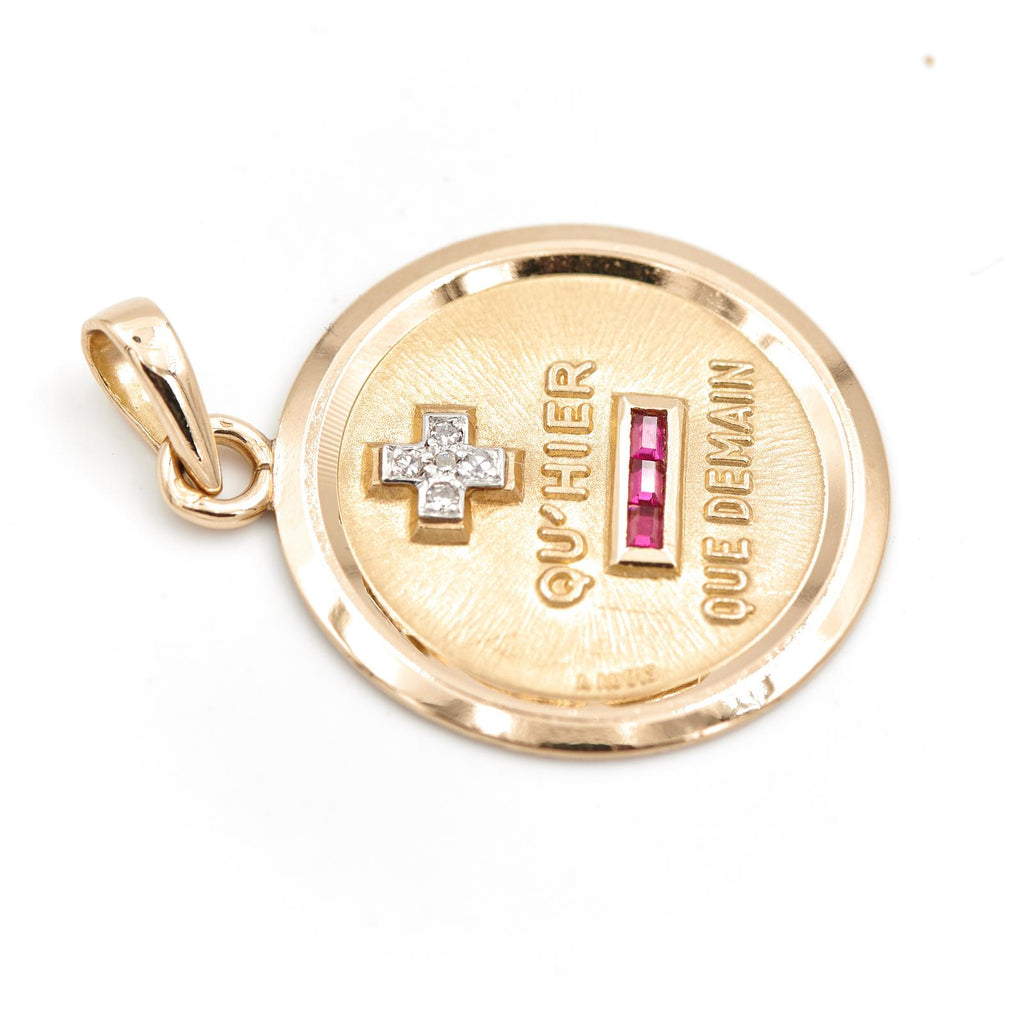Médaille signée Augis en or jaune et or blanc 750 millièmes (18 carats), Modèle + qu'hier - que demain, sertie de 5 diamants taille brillant d'environ 0,01 ct chacun, Diamants estimés G/VS, 3 rubis taille baguette d'environ 0,01 ct chacun, Poids total des diamants: 0,05 ct, Poids total des rubis: 0,03 ct, Longueur: 3,33 cm, Largeur: 2,36 cm, Poids total: 5,69 g, Poinçon tête d'aigle, Excellent état