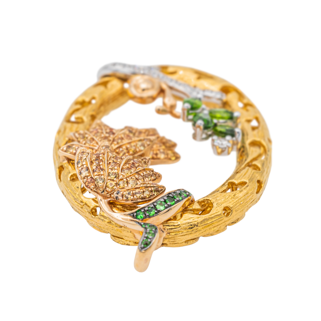 Pendentif en or jaune, rose et blanc 750 millièmes (18 carats), serti de saphirs orange, vert, jaune et de diamant, 4 saphirs vert taille navette, d'un poids total d'environ 0,40 ct (chaque saphirs verts d'un poids d'environ 0,10 ct), entourés de 17 diamants taille brillant, environ G-SI, d'un poids total d'environ 0,15 ct (chaque diamant d'un poids d'environ 0,008 ct), entourés de 94 saphirs verts, jaune et orange d'un poids total d'environ 0,56 ct (76 saphirs orange et jaune, 18 saphirs verts d'un poids d'environ 0,005 ct chacun), dimensions avec la bélière : 3,92 cm x 2,44 cm, poids total : 11,49 g, poinçon hibou, excellent état