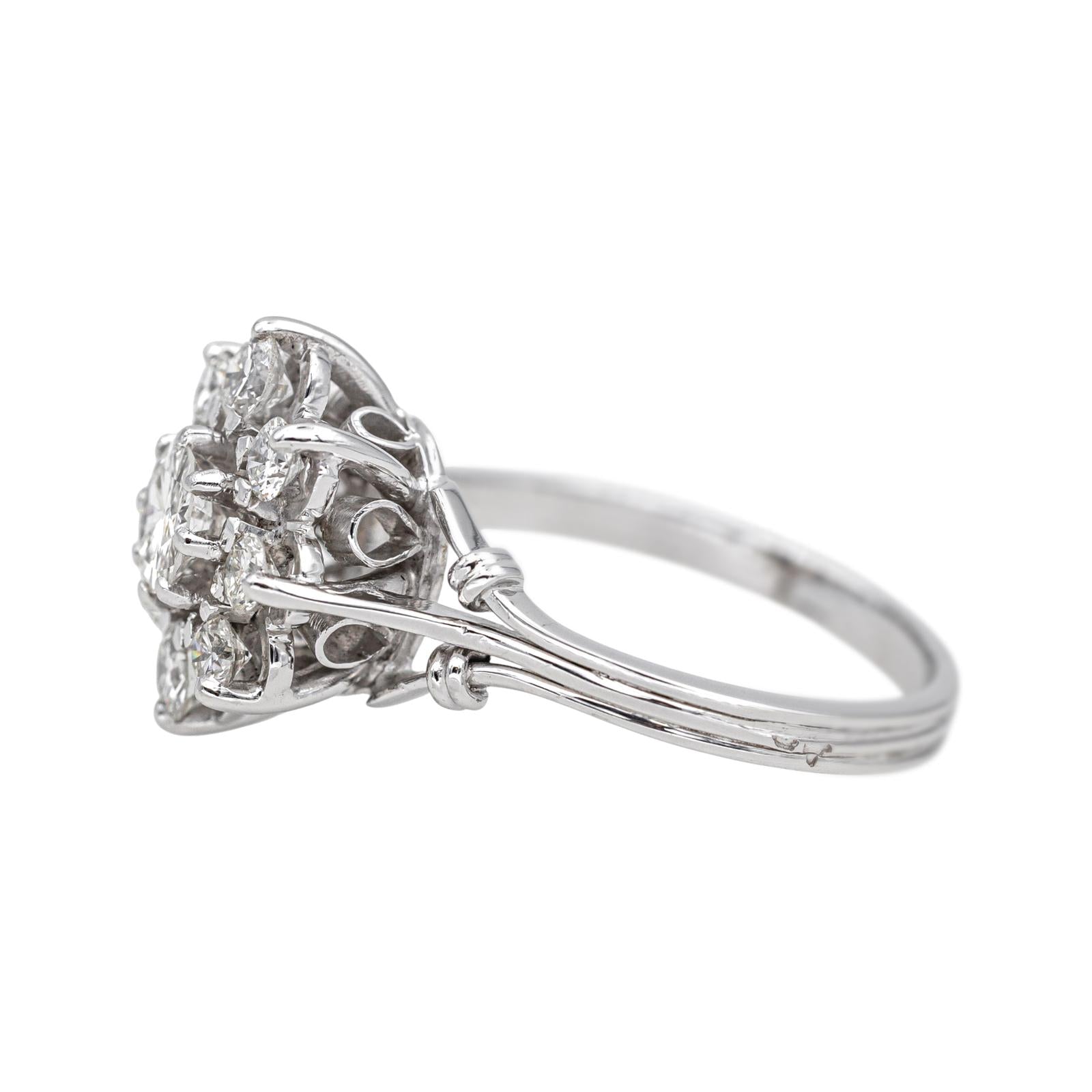 Bague en or blanc 750 millièmes (18 carats) et platine 950 millièmes, sertie de 9 diamants taille brillant, environ G-SI, d'un poids total d'environ 0,87 ct, (1 diamant d'environ 0,43ct, 2 diamants d'environ 0,10 ct chacun et 6 diamants d'environ 0,04 ct chacun), largeur sur le dessus : 1,38 cm, tour de doigt : 55, poids total : 5,49 g, poinçon tête d'aigle et tête de chien, excellent état